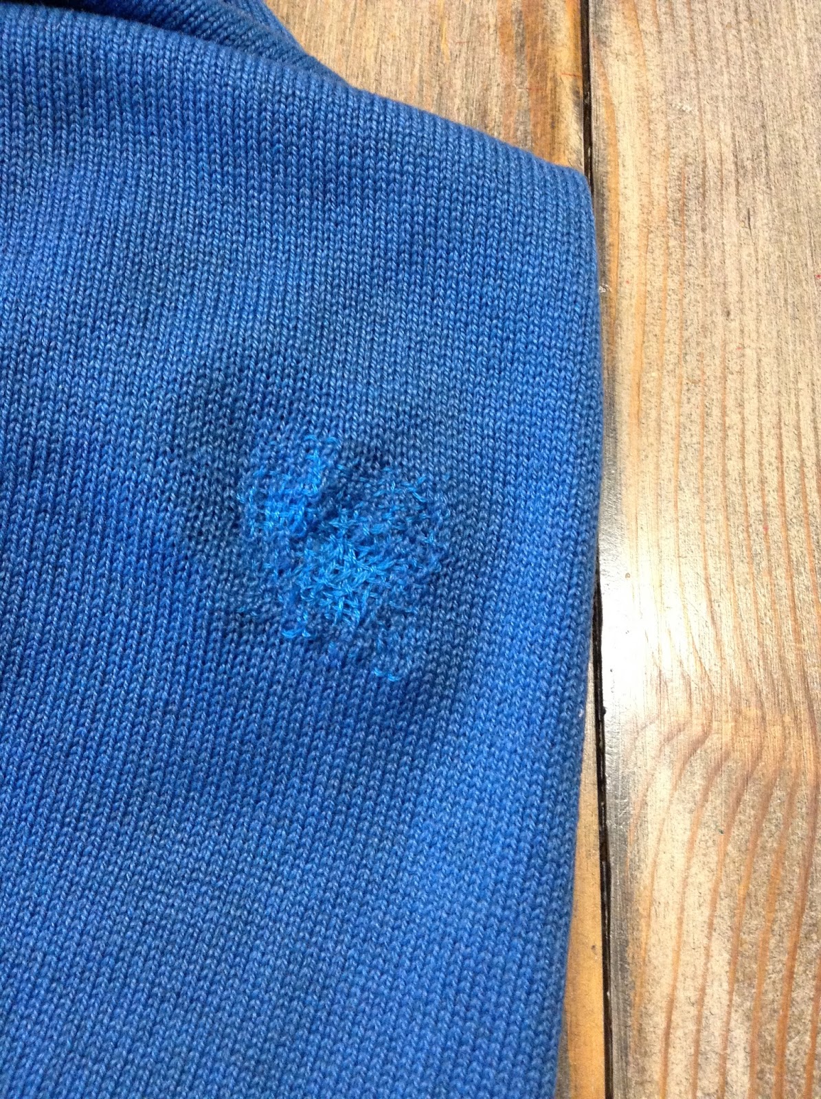 Here's the major hole before darning. Incidentally I use embroidery thread where a fine thread is called for, because I don't know whether VERY fine mending wool exists, e.g. suitable for merino wool garments. I have not found any. One of my other customers has a box choc a block full of really good quality mending wool, which she gives me to use for her mending, and none of it is fine enough to use for this sort of garment.